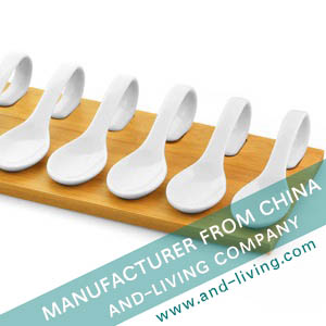 SET OF 6 PORCELAIN APPETIZER SPOONS WITH BAMBOO TRAY